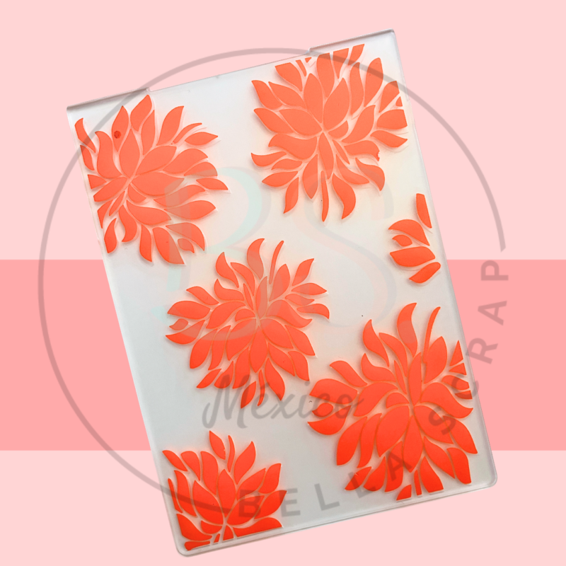 Es una plantilla de plástico resistente con relieves internos que, al ser pasada por una máquina de embossing o troqueladora manual, presiona el papel y crea un diseño elevado (en relieve). Existen múltiples estilos y patrones: flores, geométricos, vintage, navideños, entre otros.
